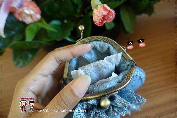 Amy手上的是灰藍色的手工蕾絲復古口金包,