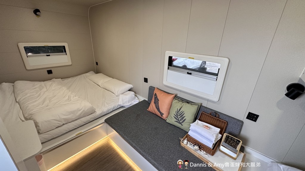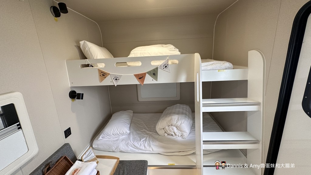 露營車內包含了沙發、茶几、毛巾、浴巾、冷暖空調(冷氣)、除濕機、熱水瓶、水杯,基本上真的是只要帶行李即可入住, 露營車的空間算是適中,有1個雙人床加上上下舖,最多可睡4人。